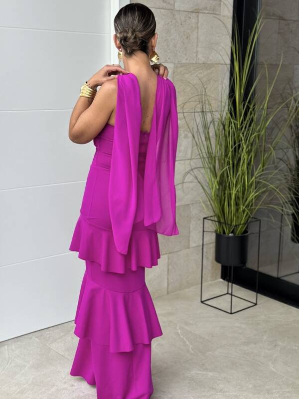 Vestido escote bardot de lycra largo, corte lateral cruzado.