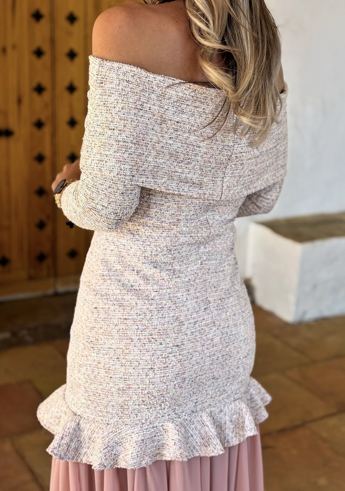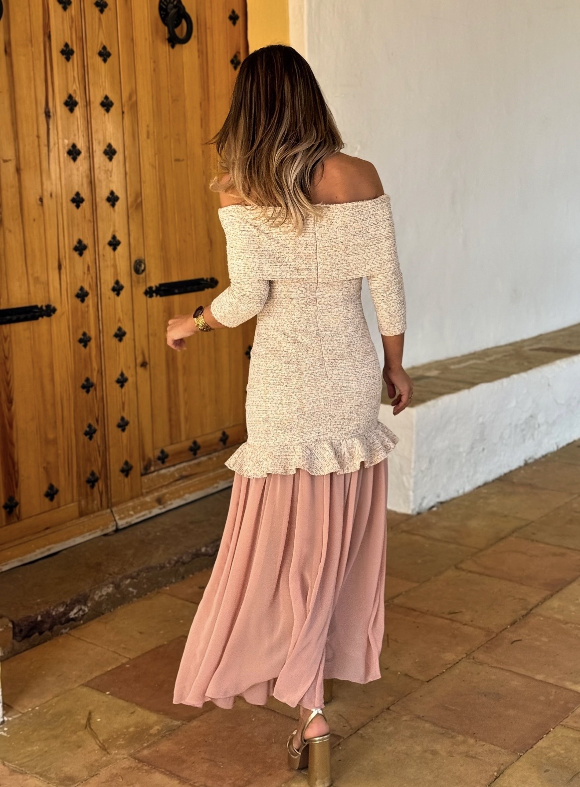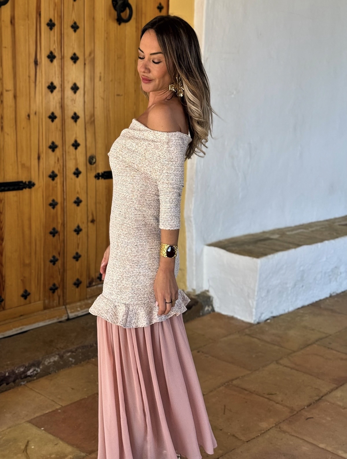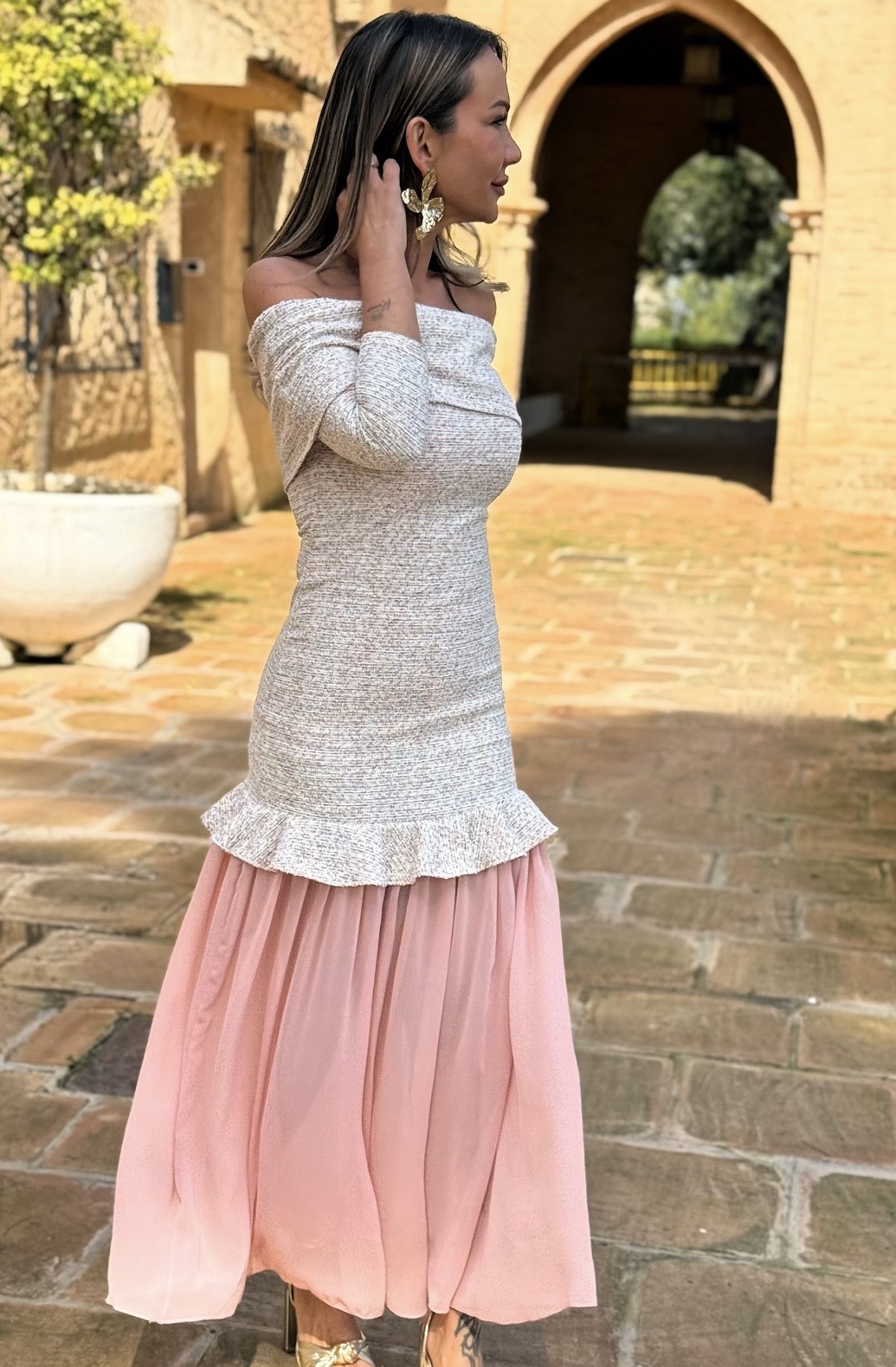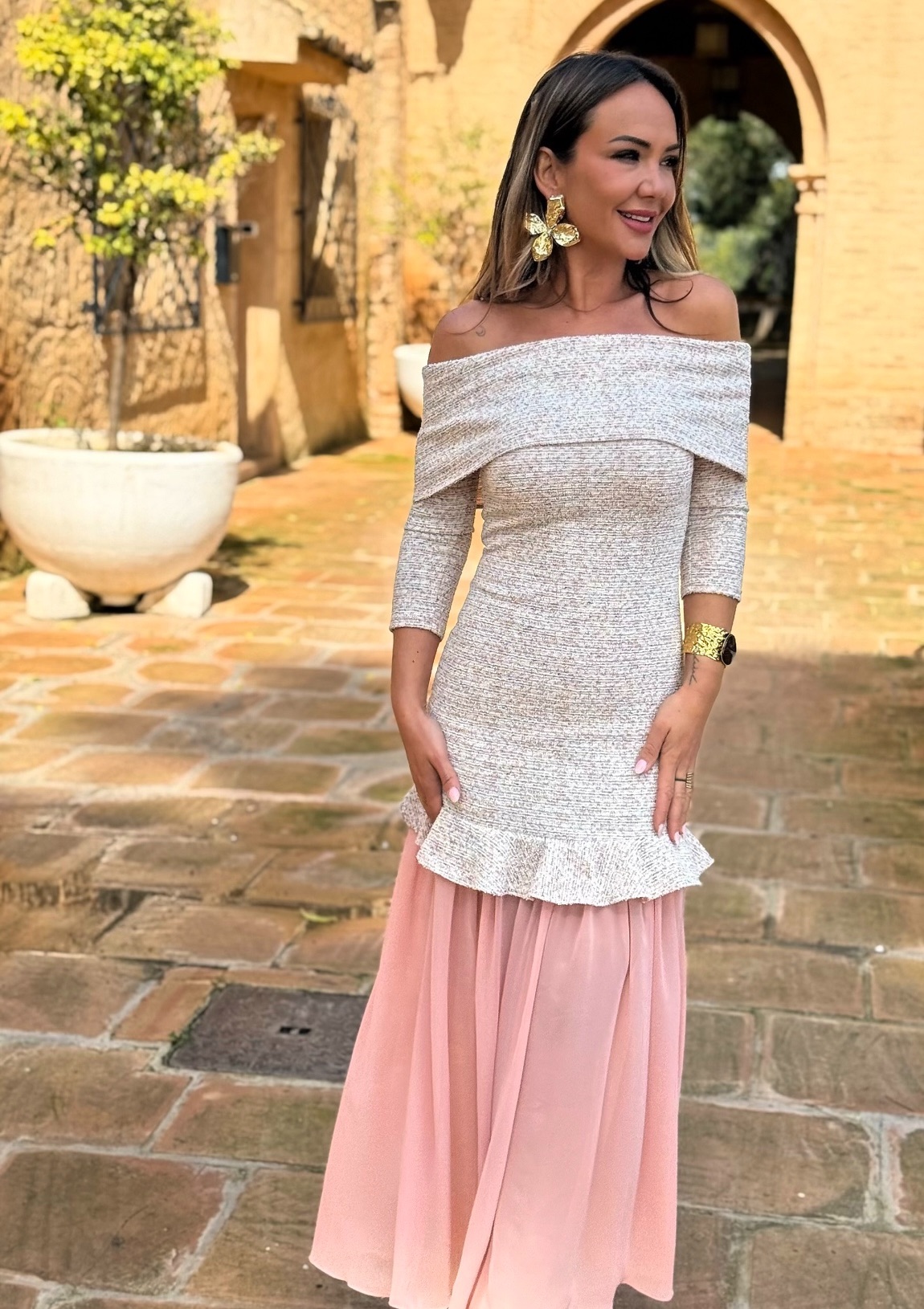 Vestido escote bardot media manga y falda gasa.