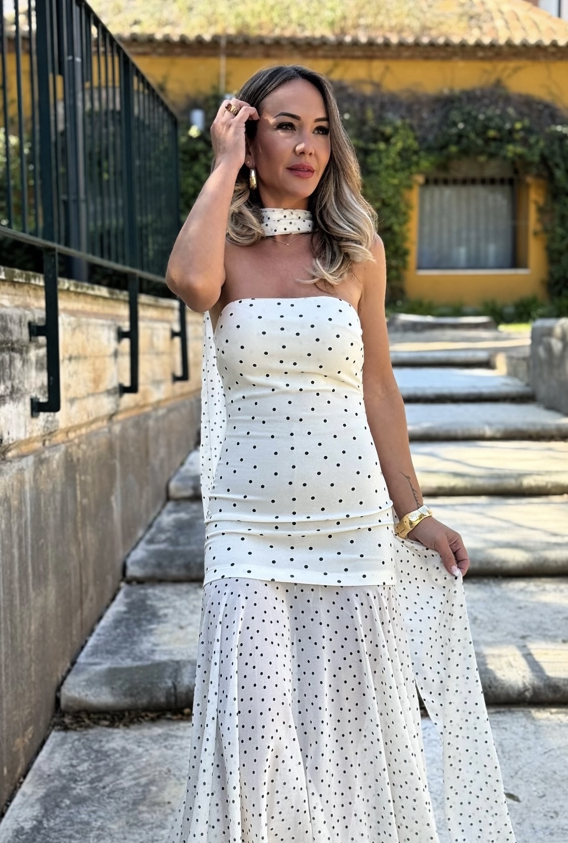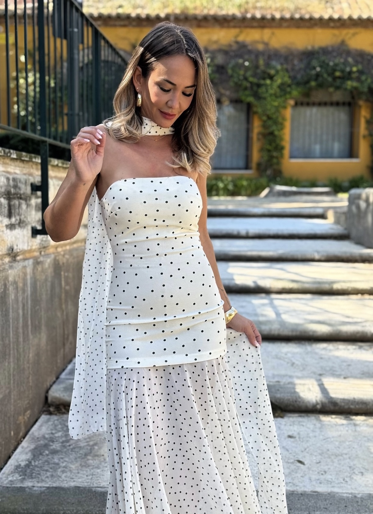 Vestido largo palabra de honor con falda de gasa y fular de gasa.