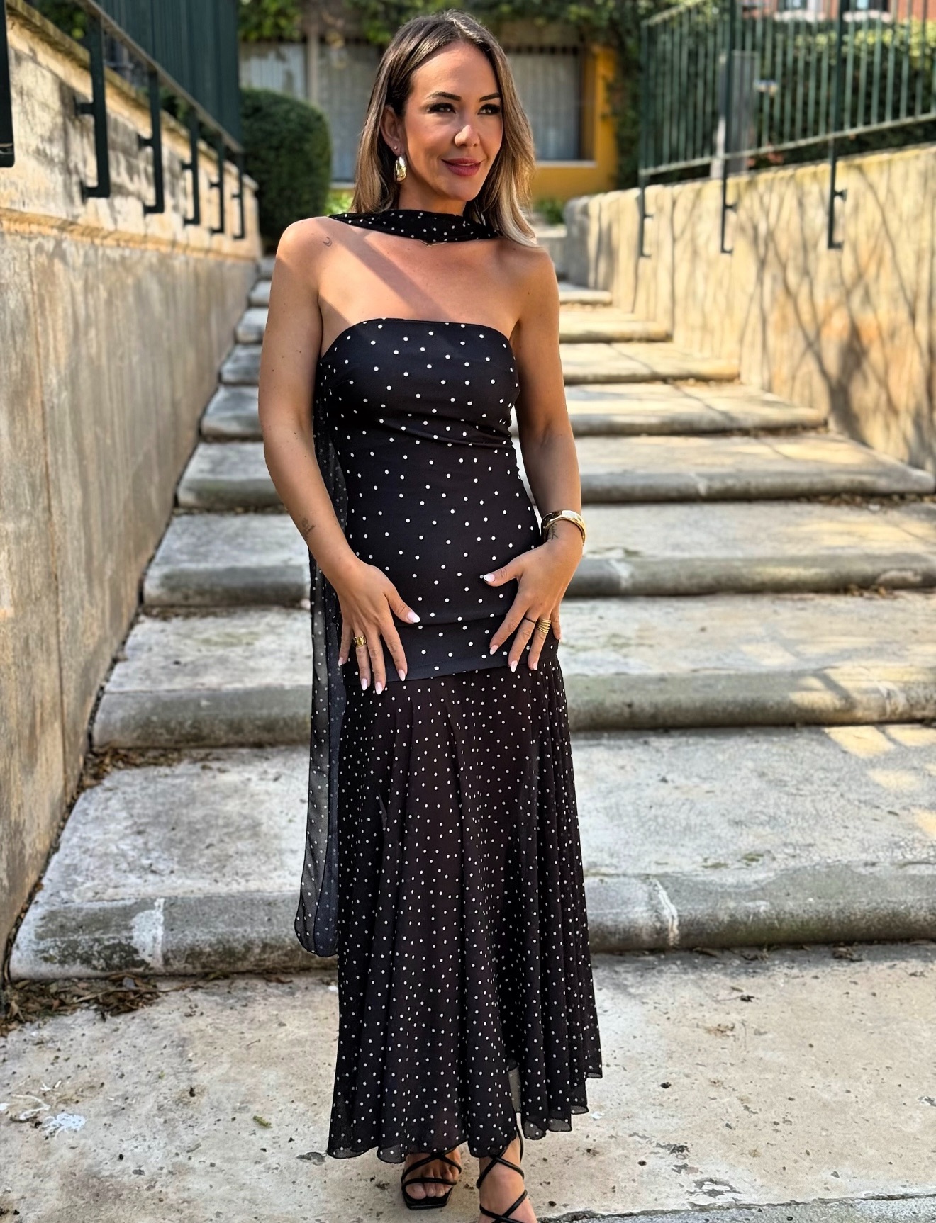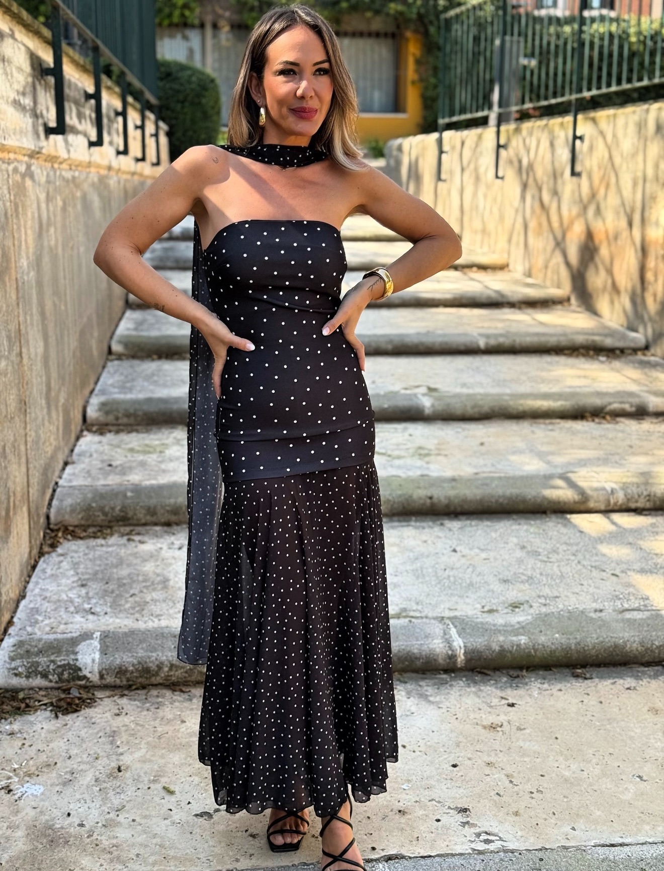 Vestido largo palabra de honor con falda de gasa y fular de gasa.