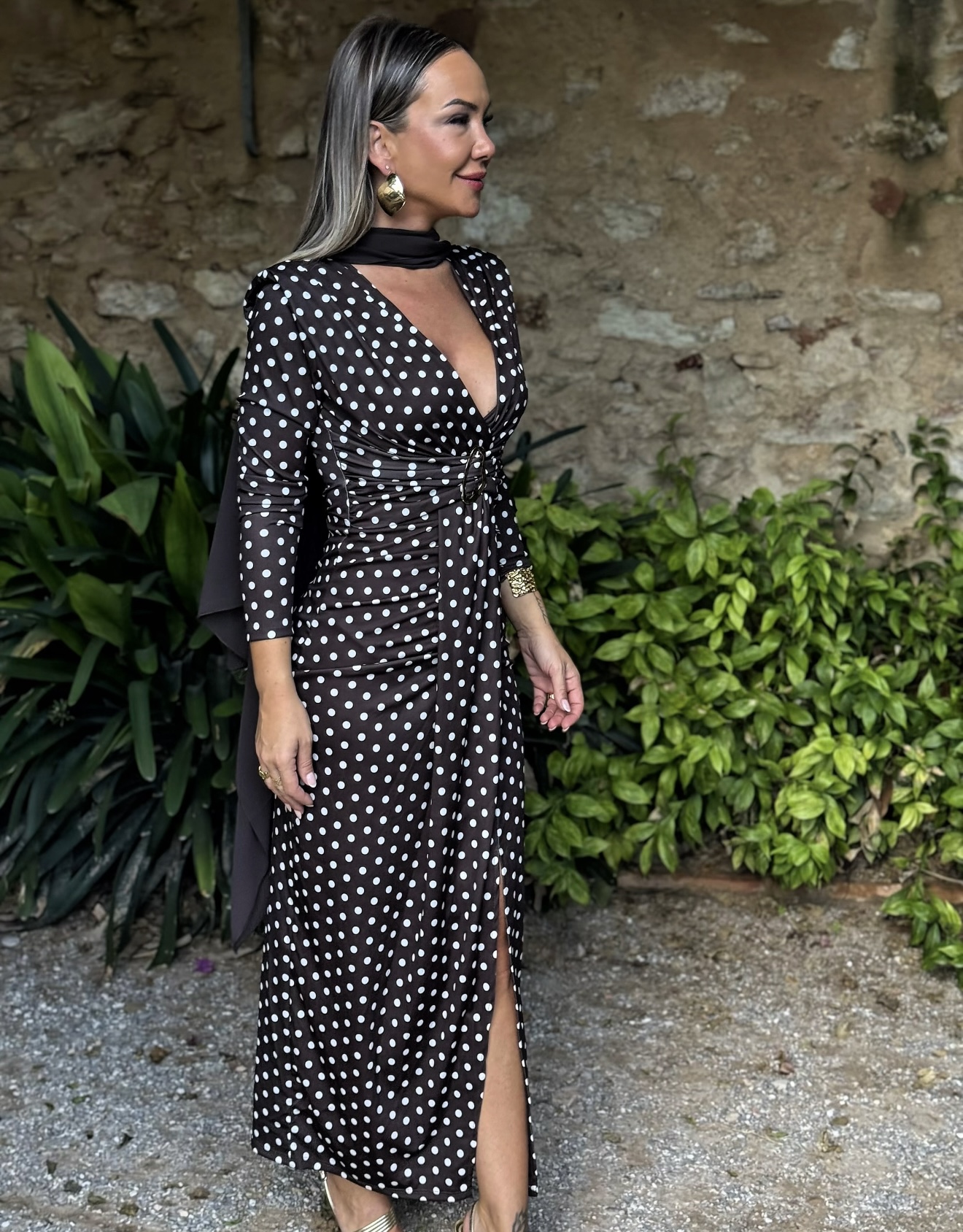 Vestido midi manga larga escote profundo con detalle hebilla dorada central y corte lateral.