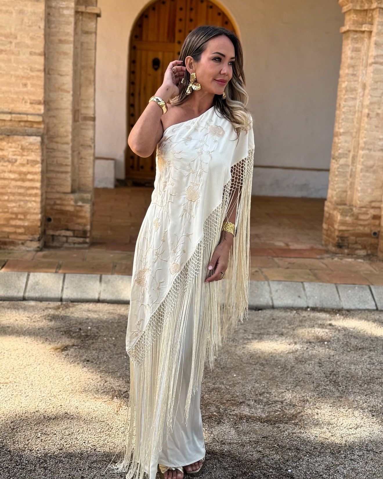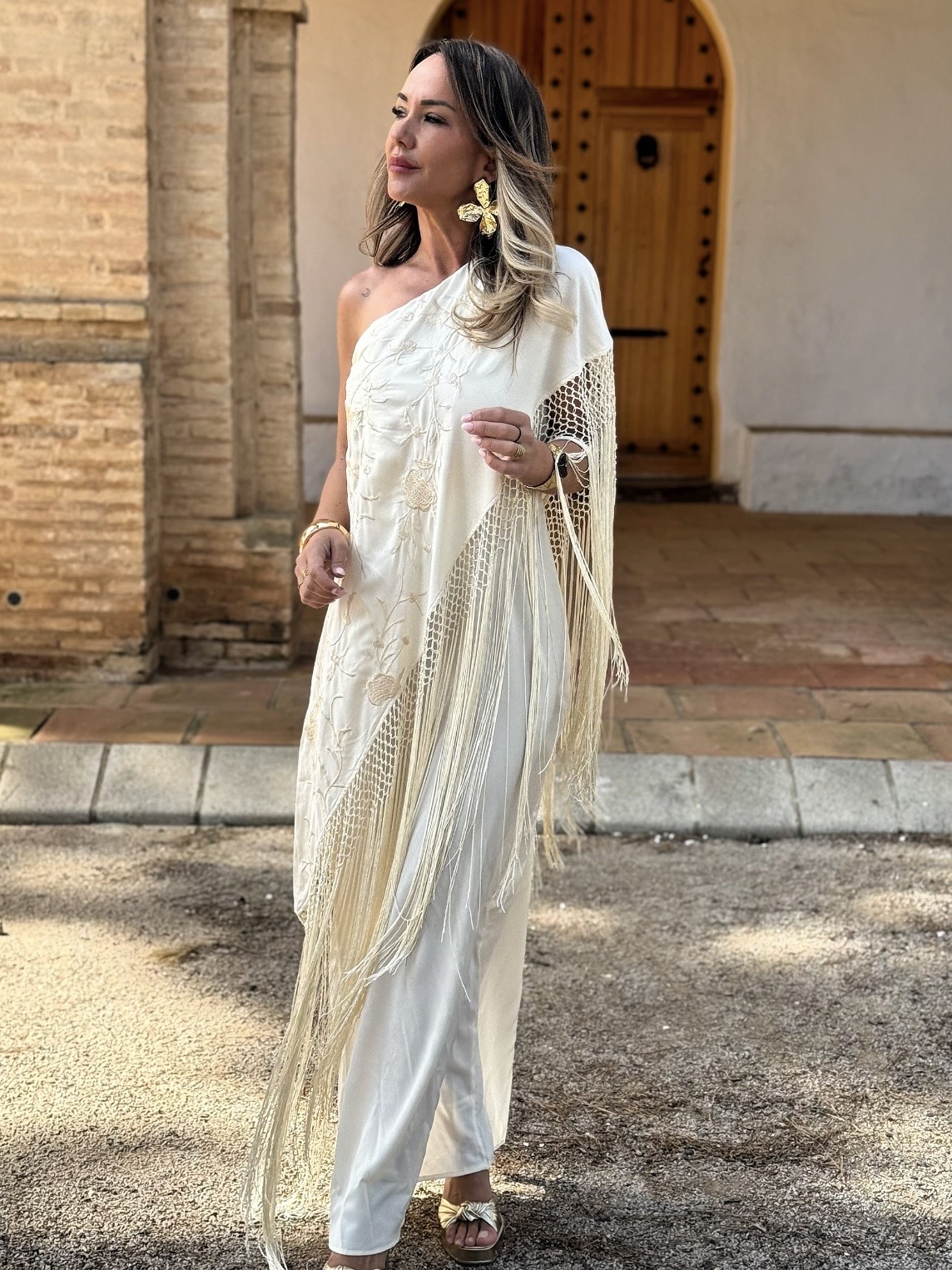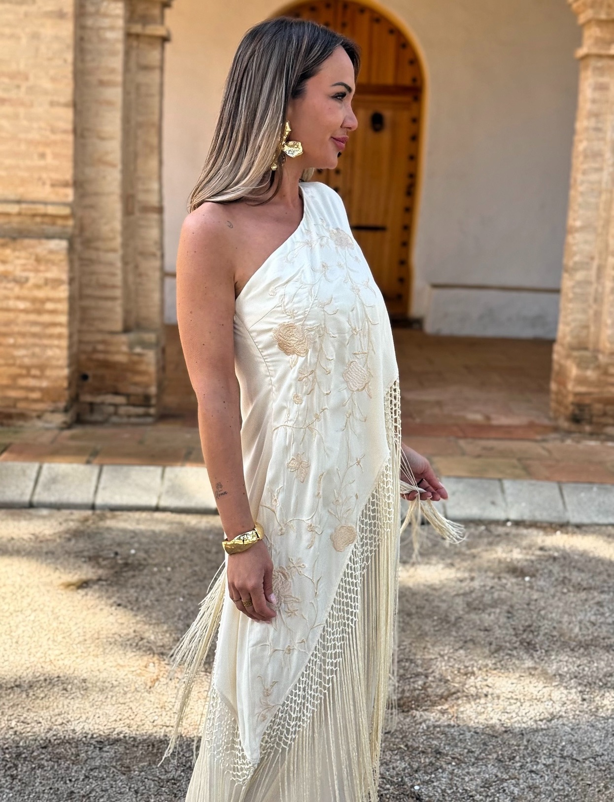 Vestido asimétrico imitando mantón con flores bordadas y flecos, corte detrás.