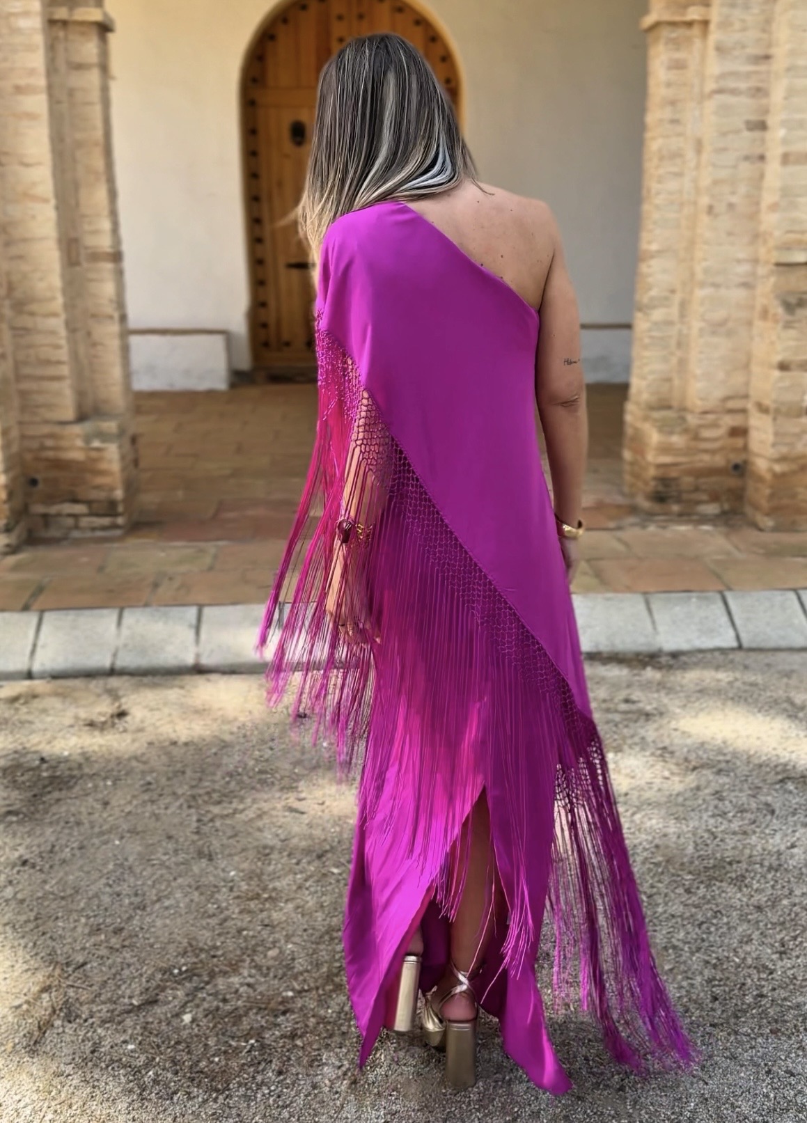 Vestido asimétrico imitando mantón con flores bordadas y flecos, corte detrás.