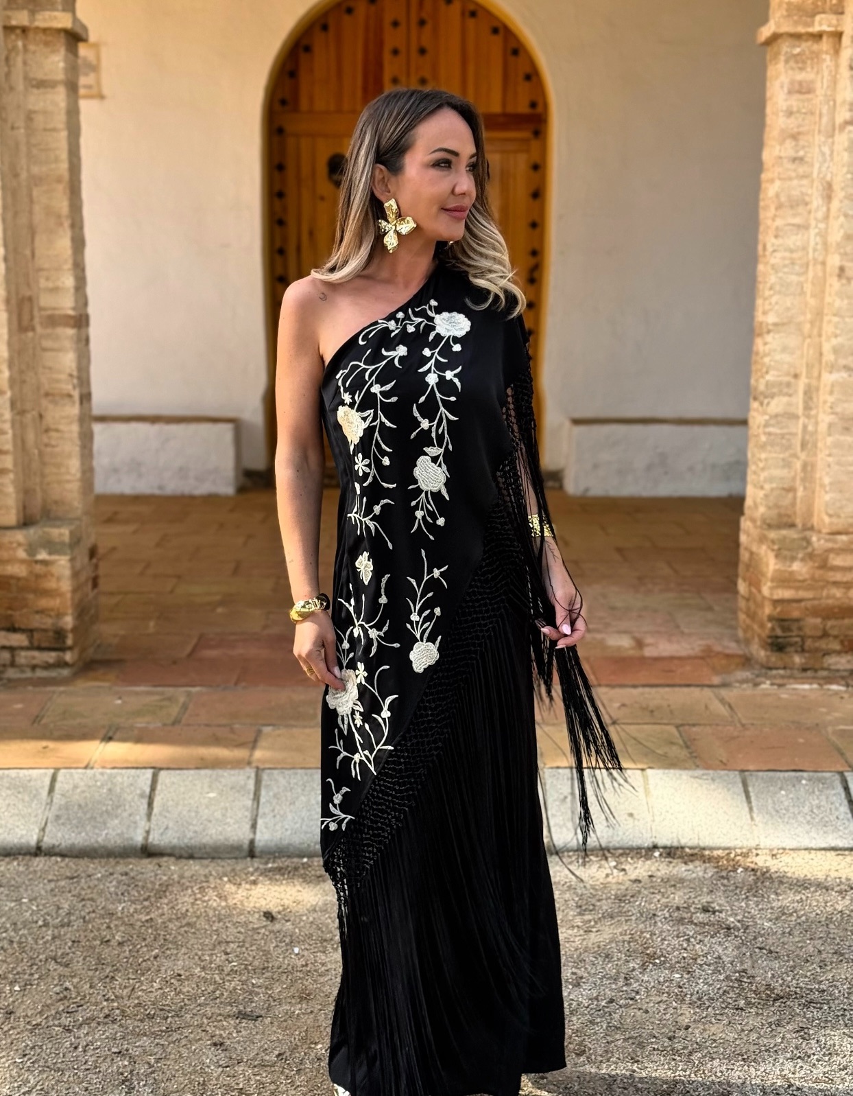 Vestido asimétrico imitando mantón con flores bordadas y flecos, corte detrás.