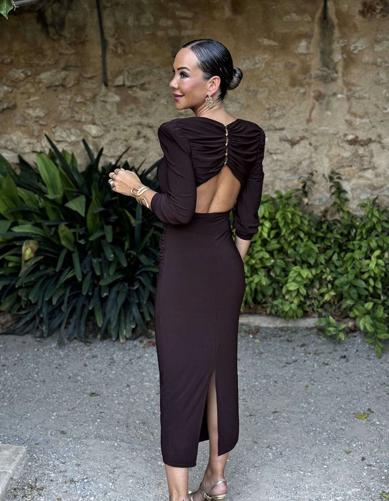 Vestido midi de punto elástico manga larga escote profundo, detalle fruncido central y espalda abertura con botones dorados y corte detras.