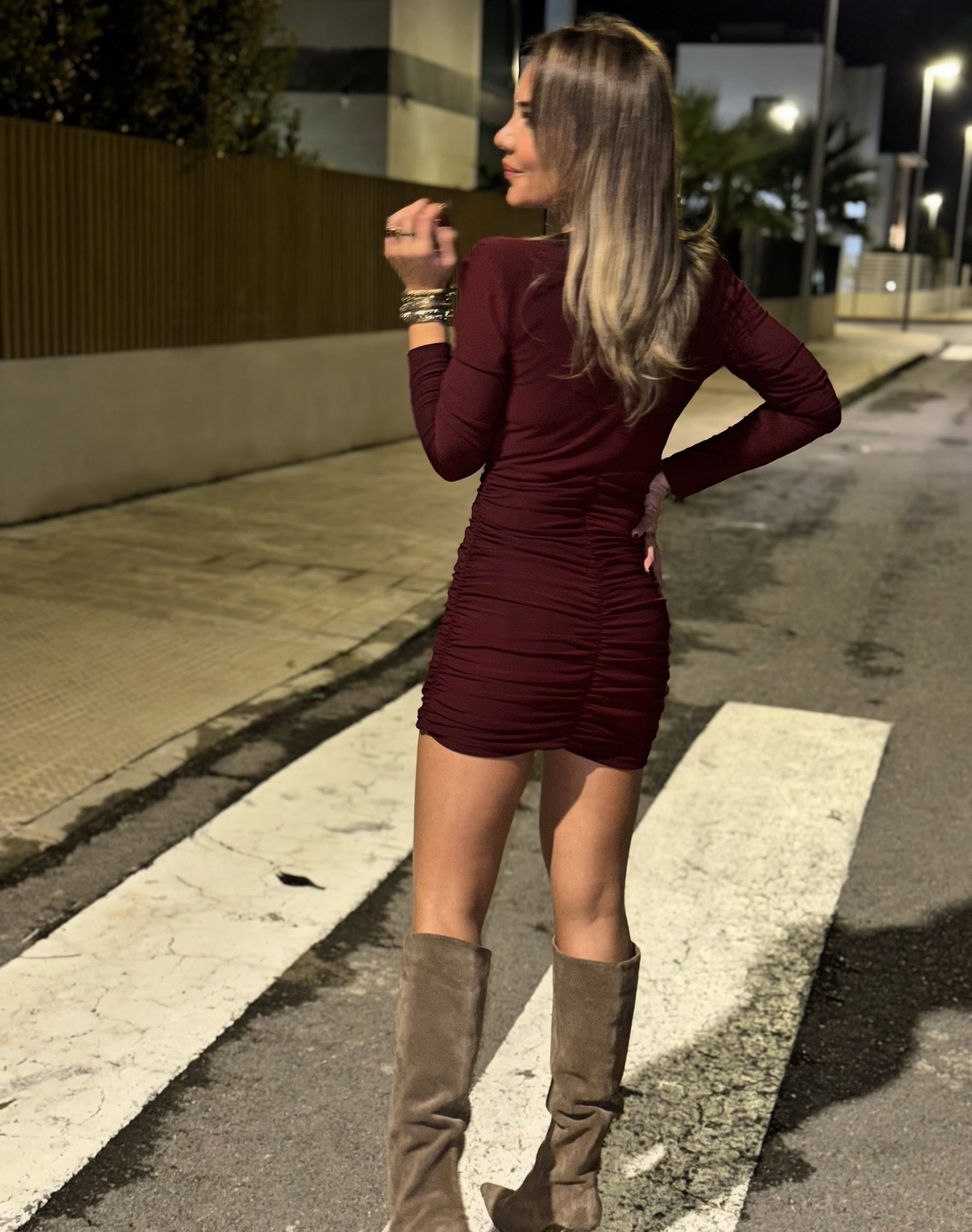 Vestido corto lycra escote pico fruncido en falda delante y detrás.