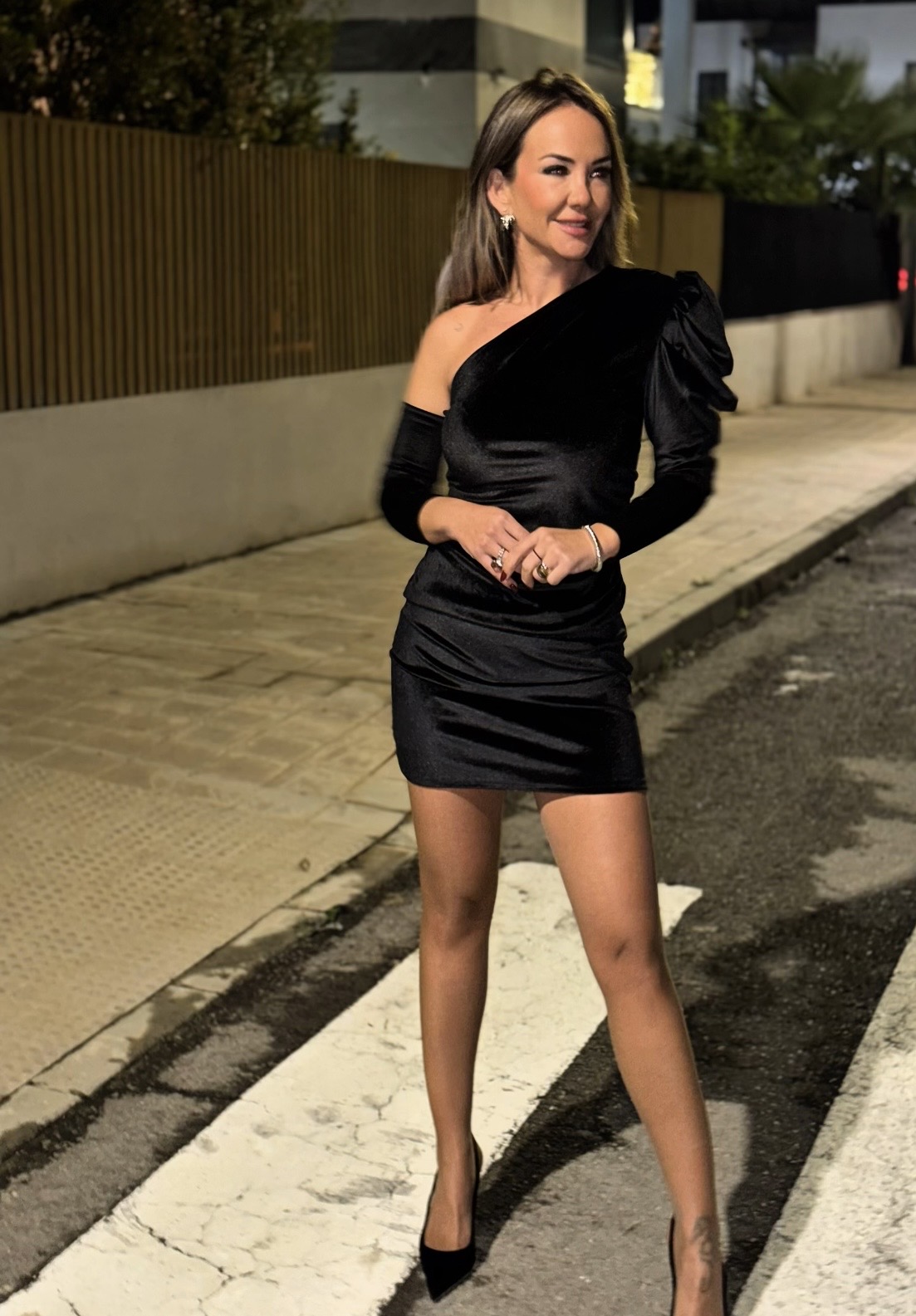 Vestido corto de terciopelo asimétrico manga abullonada, drapeado.