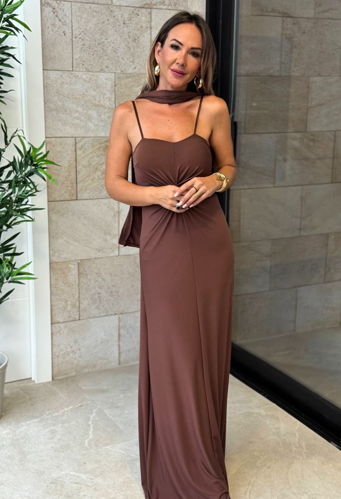 Vestido largo tirante fino ajustable con detalle nudo central y fular.