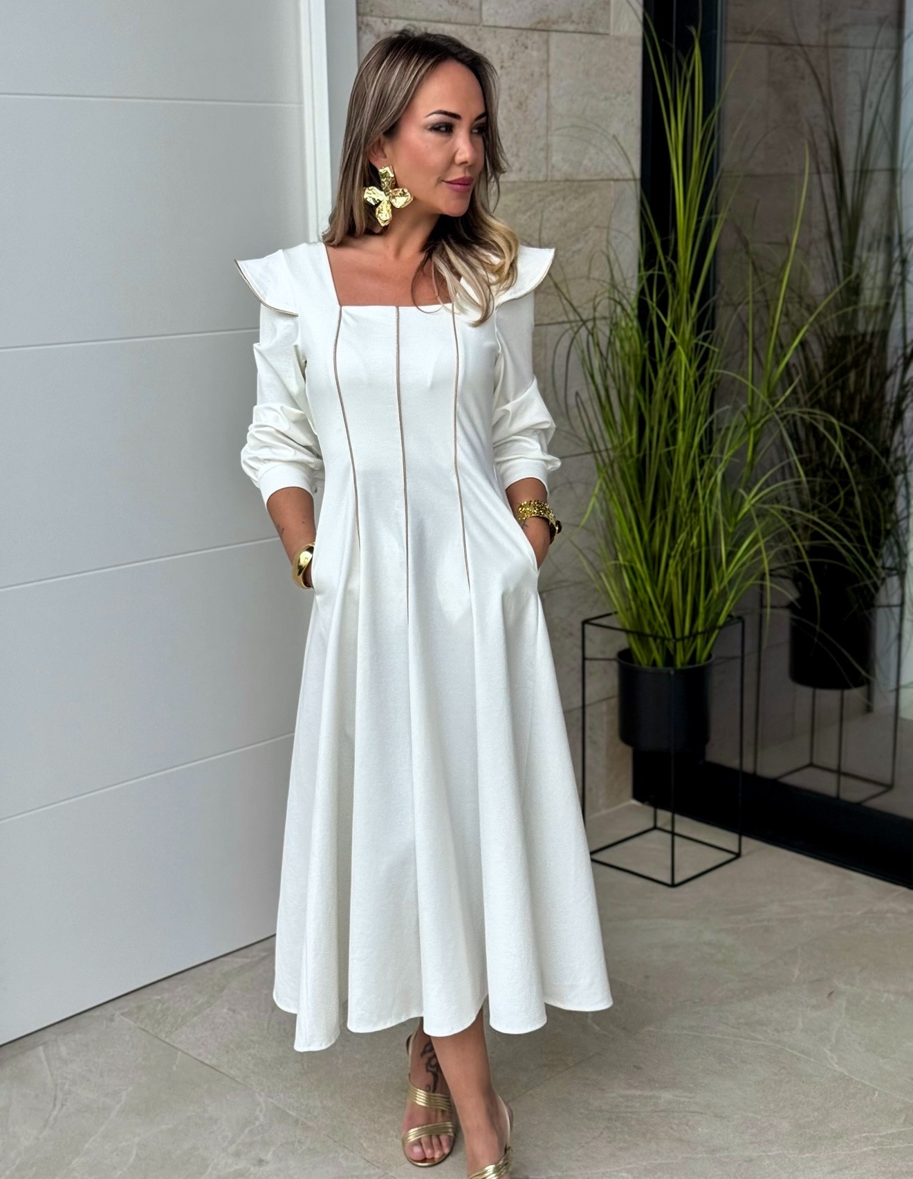 Vestido midi de poliéster con elastan manga larga detalle solapas en hombros botón en puños y falda corte capado, escote a la caja y espalda con nido de abeja.