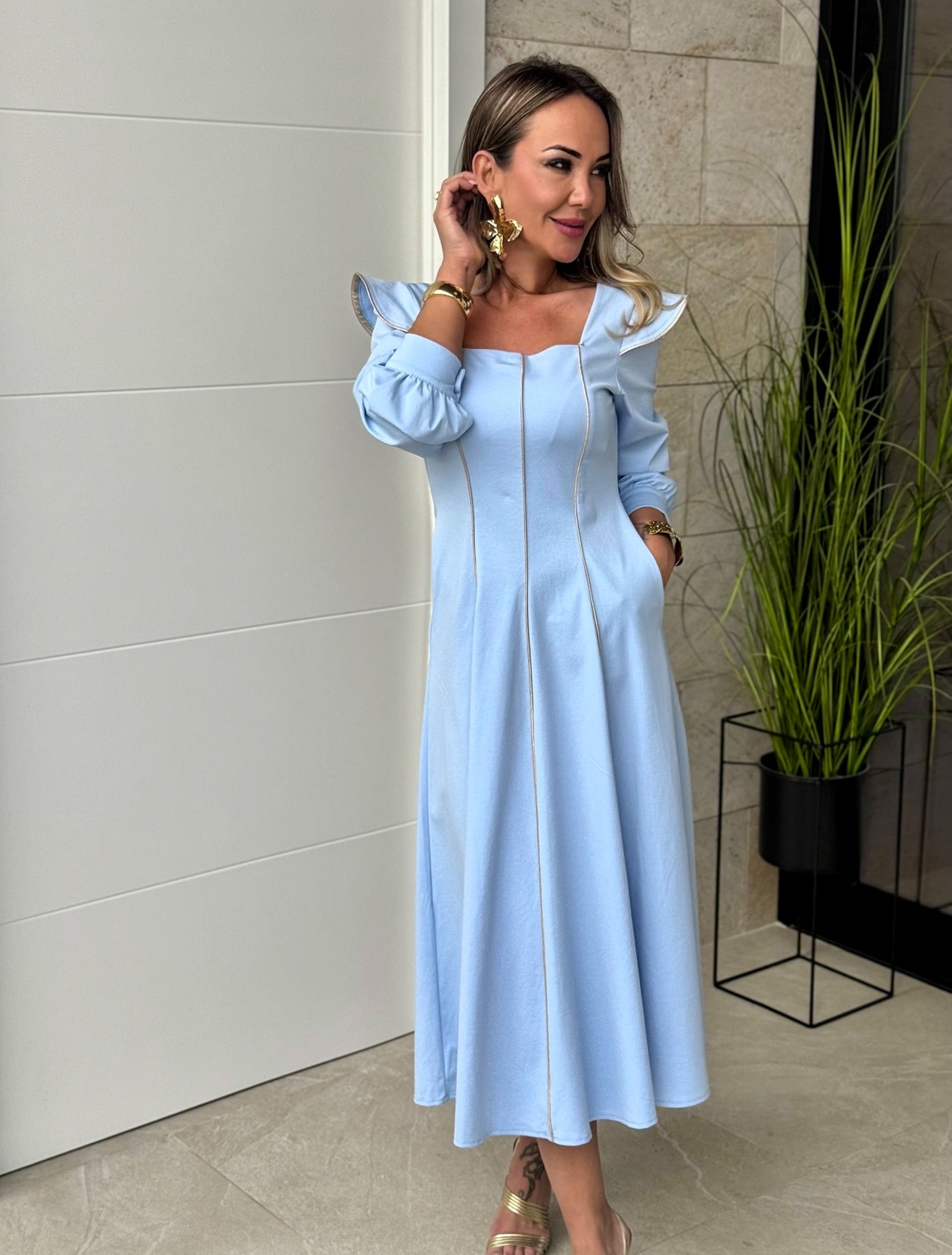 Vestido midi de poliéster con elastan manga larga detalle solapas en hombros botón en puños y falda corte capado, escote a la caja y espalda con nido de abeja.