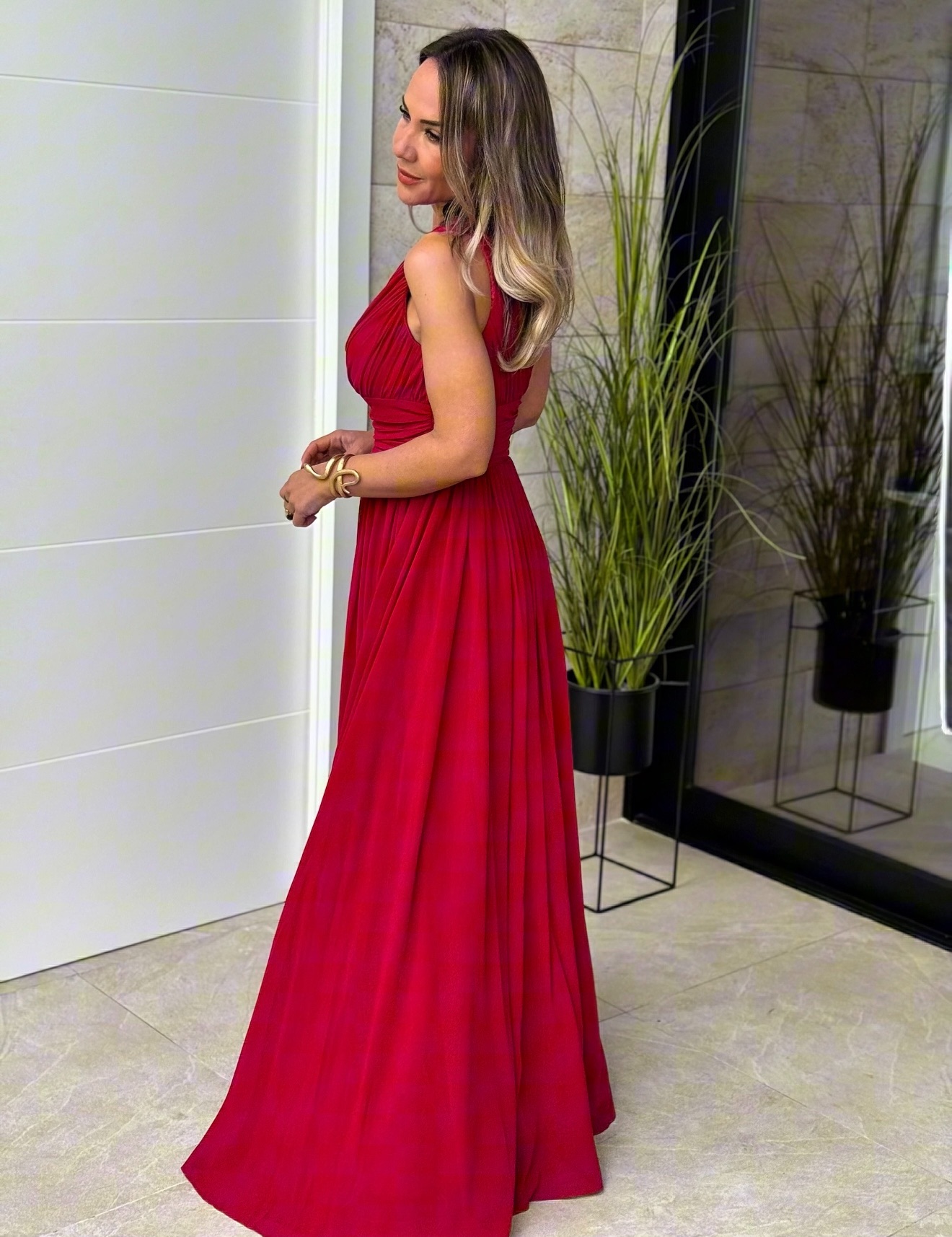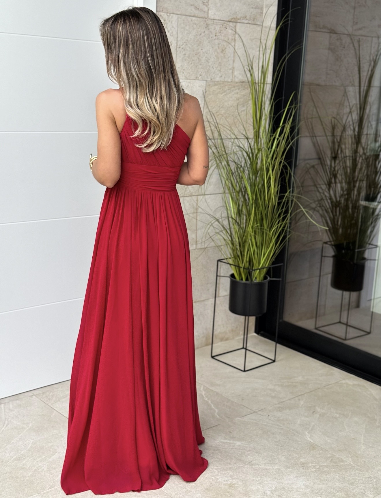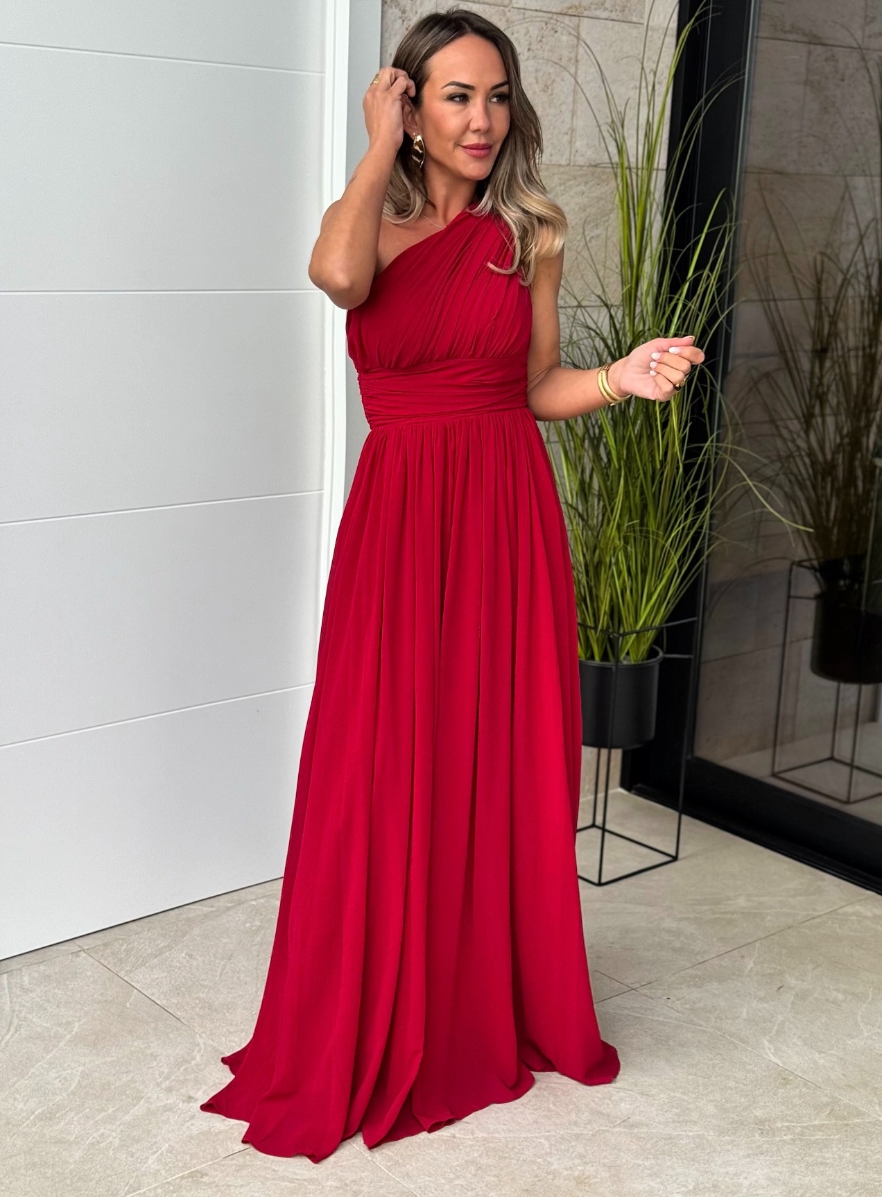 Vestido largo drapeado asimétrico con cremallera lateral invisible.