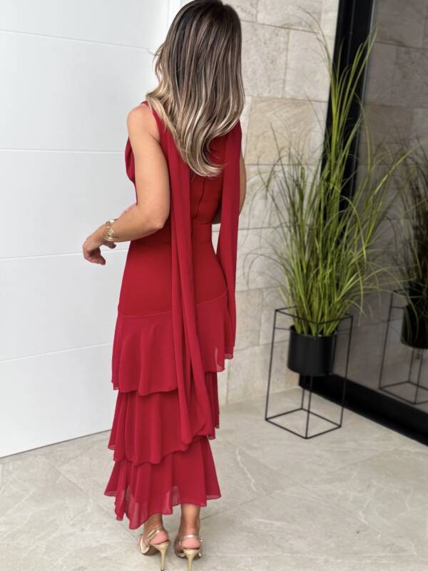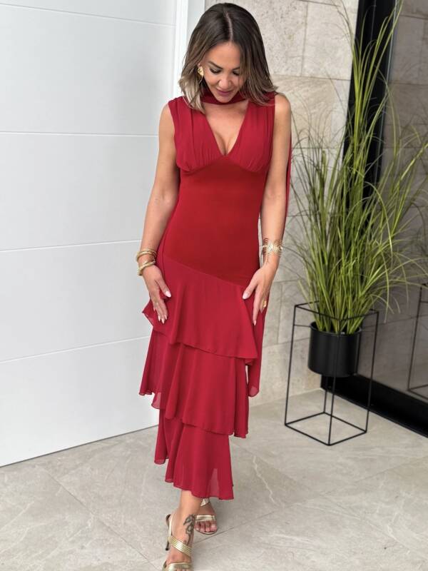 Vestido midi cuello redondo sin mangas corte detrás y detalle solapas en hombros.