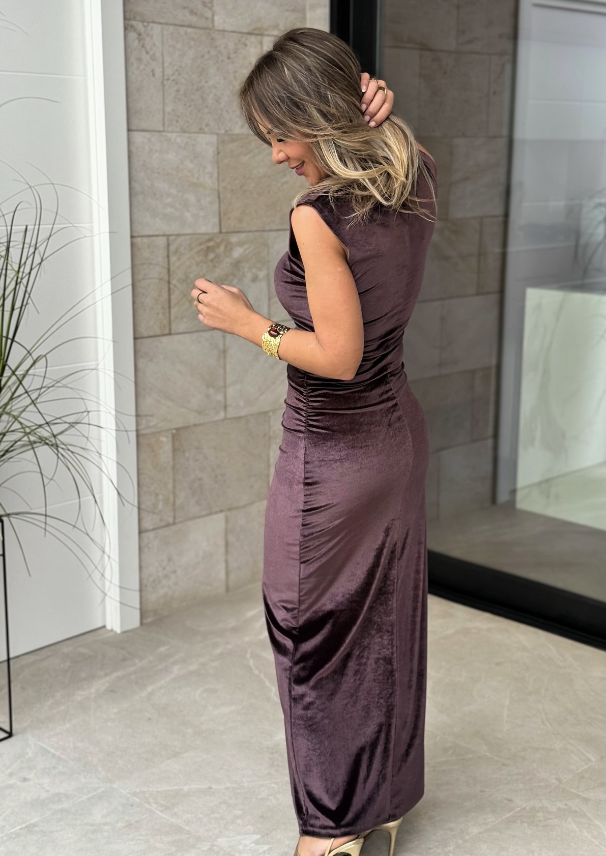 Vestido Terciopelo Aplique Dorado Berenjena