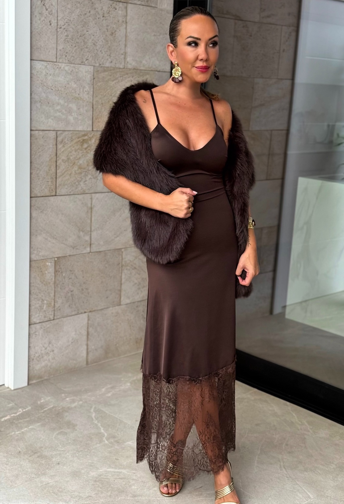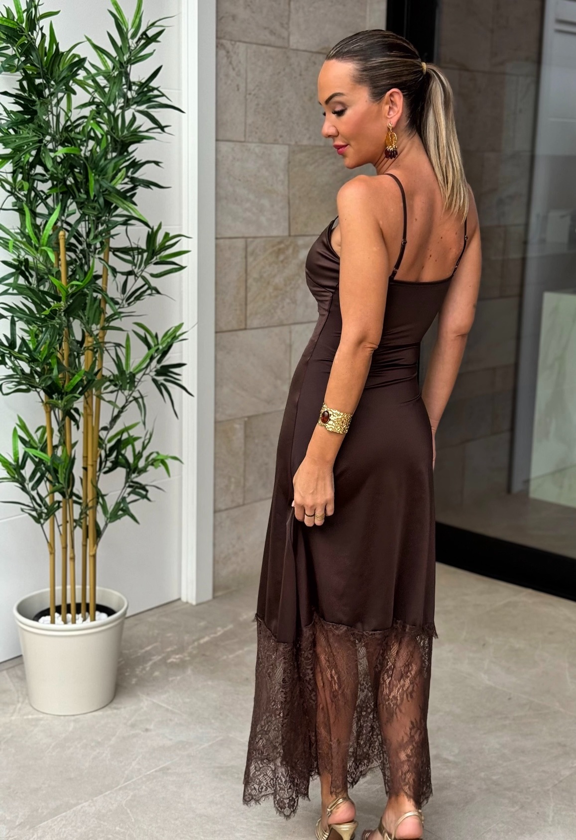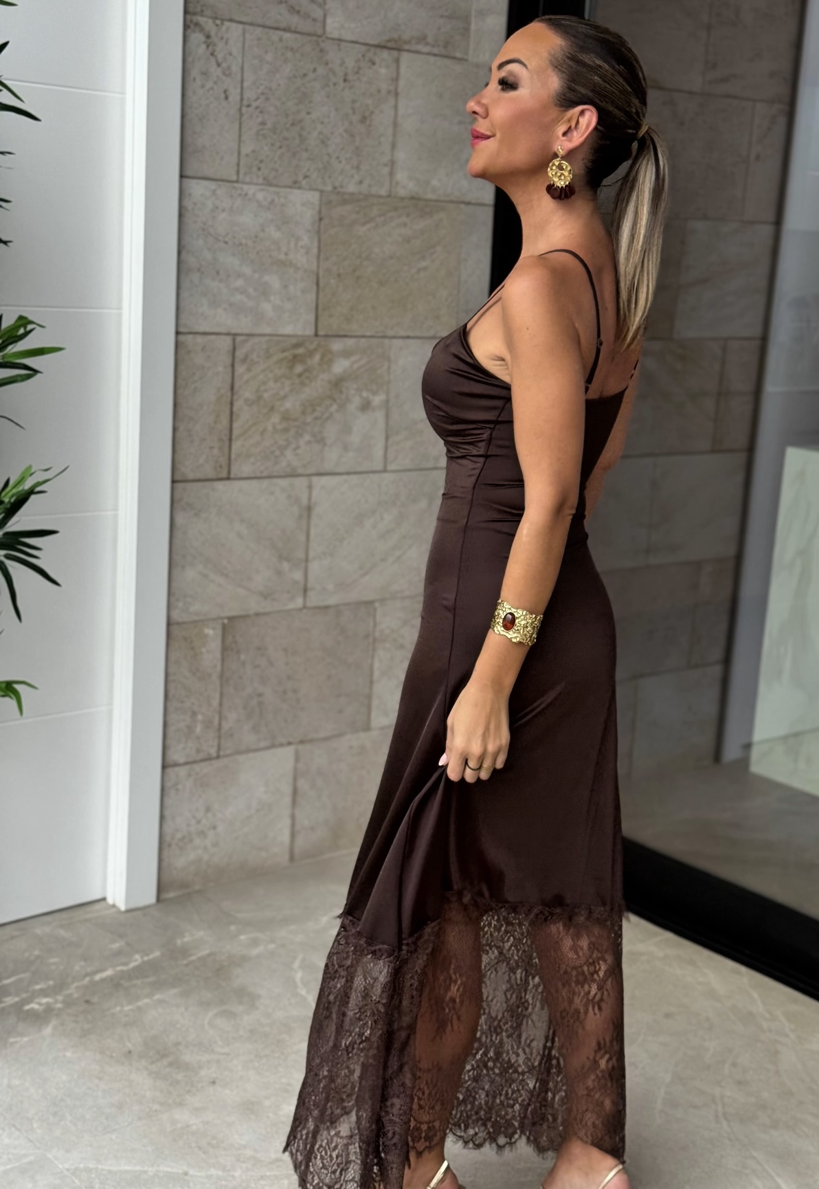 Vestido midi tirante fino regulable de lycra con encaje bajo.