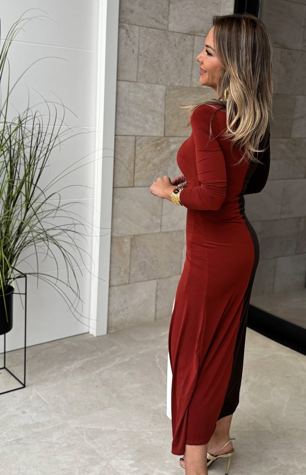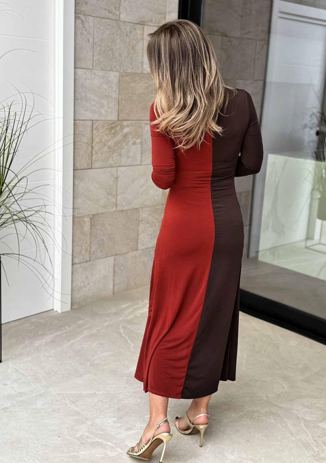 Vestido midi manga larga cuello redondo con falda capada y detalle fruncido central.