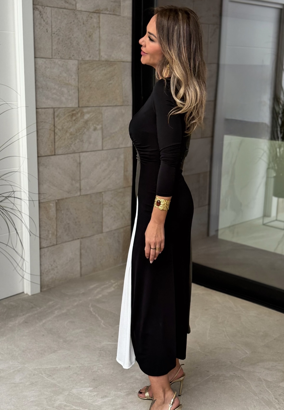 Vestido midi manga larga cuello redondo con falda capada y detalle fruncido central.