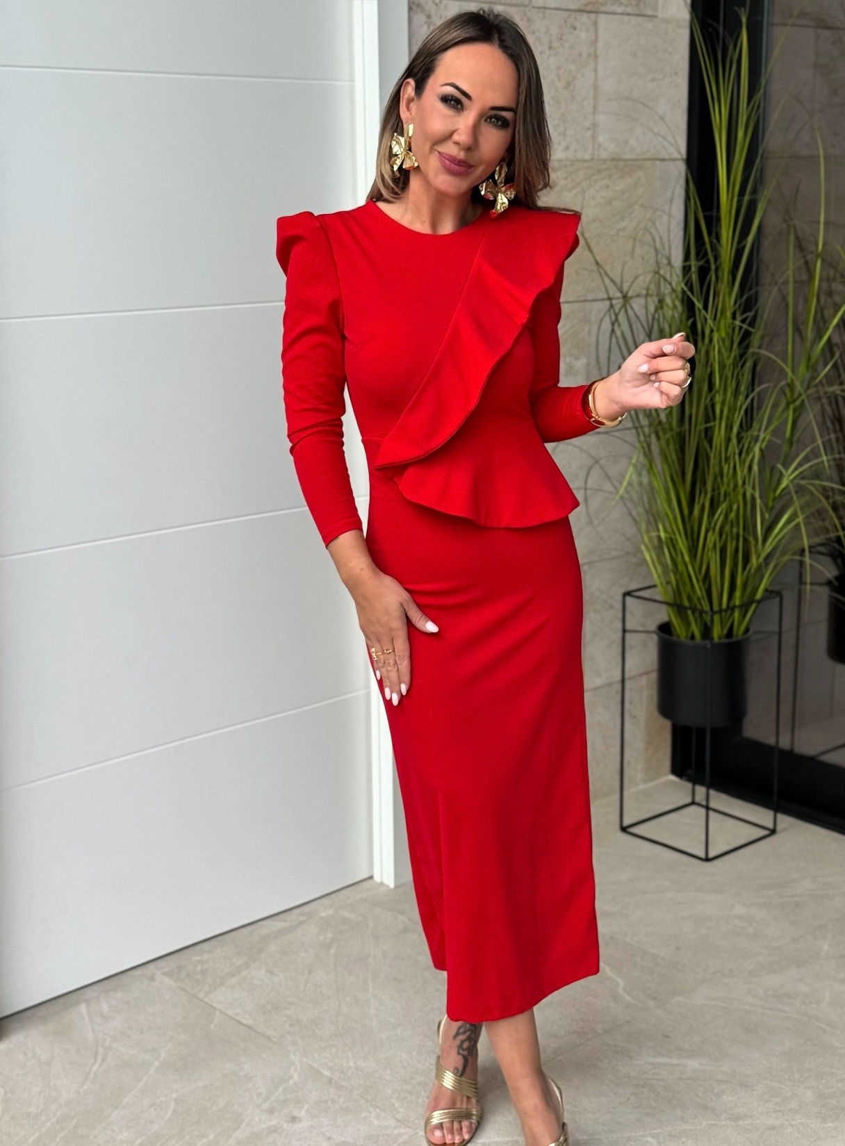 Vestido midi cuello redondo manga larga con detalle volante cruzado, corte y cremallera detrás.