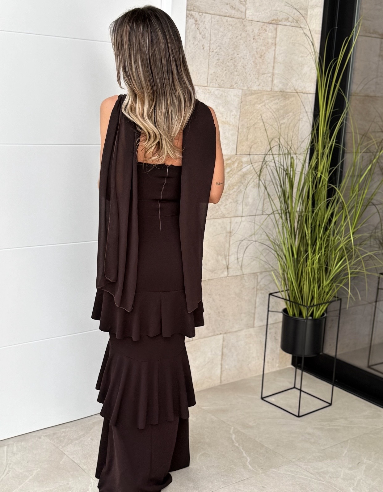 Vestido largo recto con volantes cruzado con tiras de gasa, cremallera en espalda.