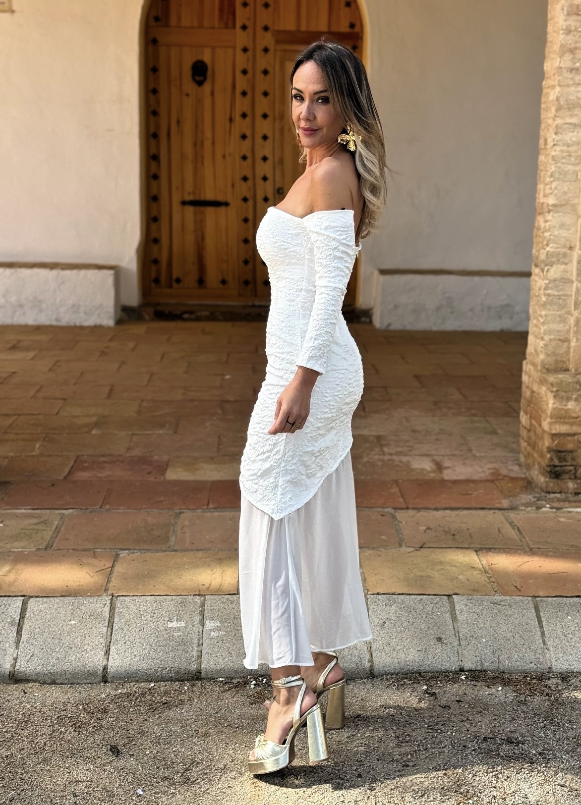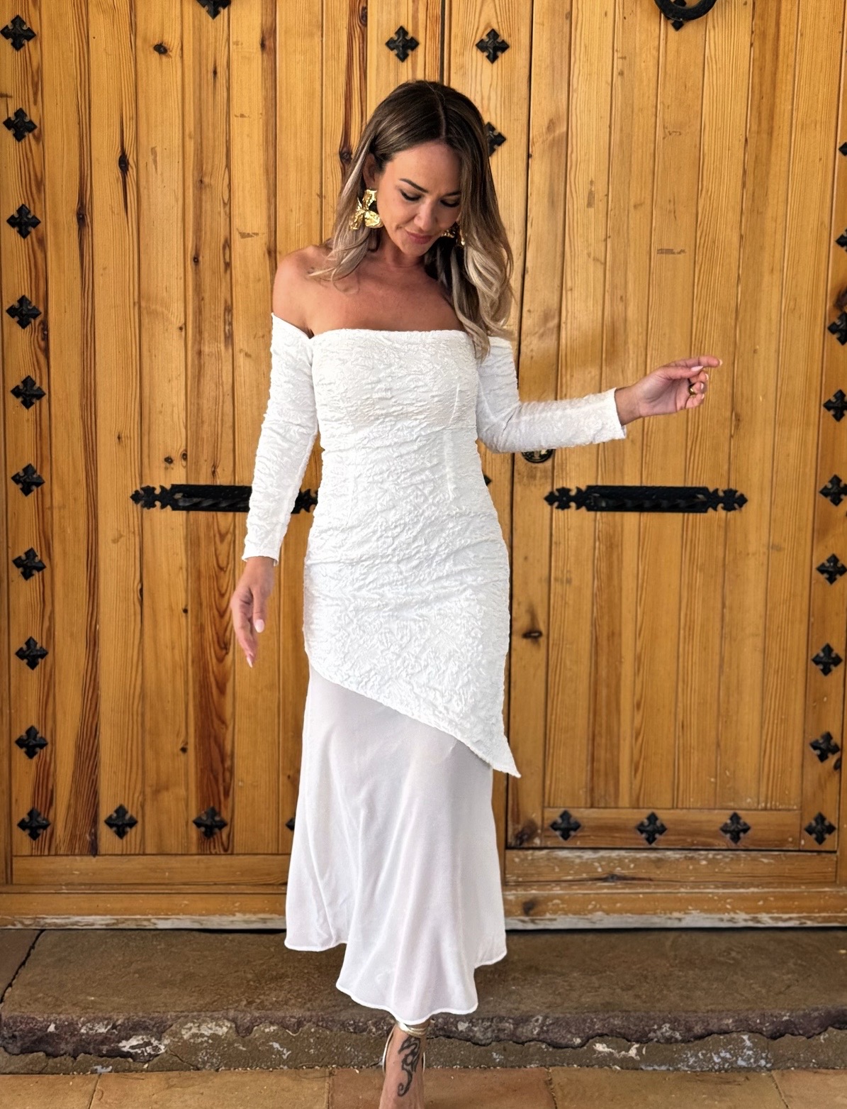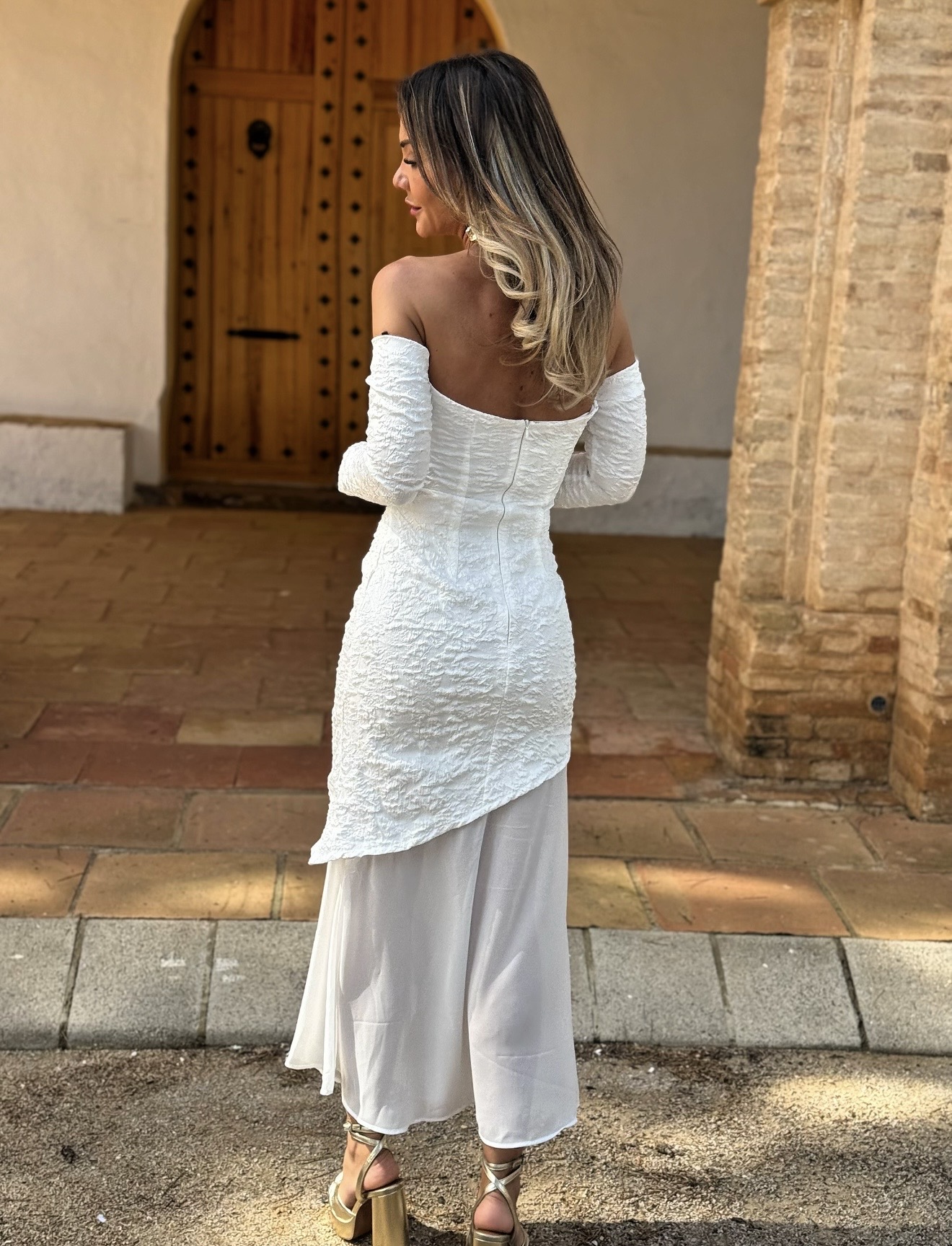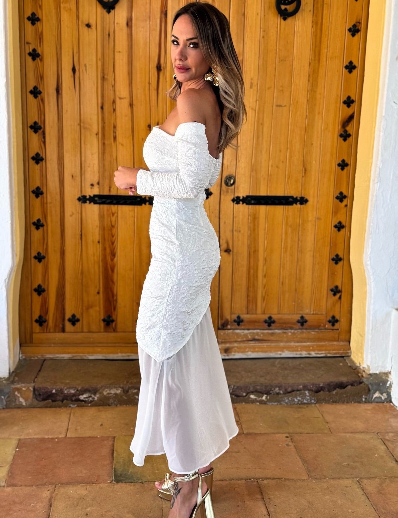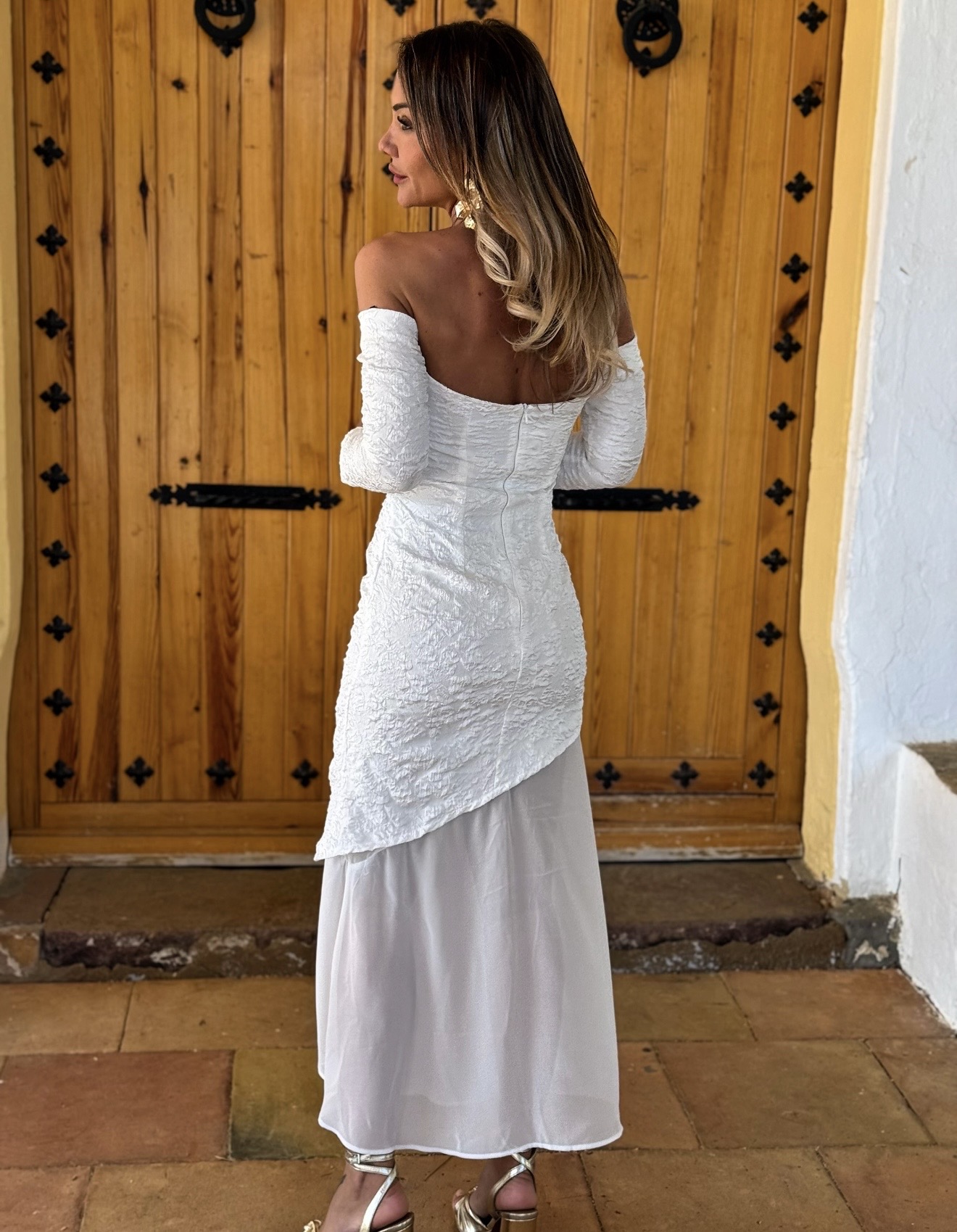 Vestido palabra de honor con mangas tejido tipo jacquard y falda tul.